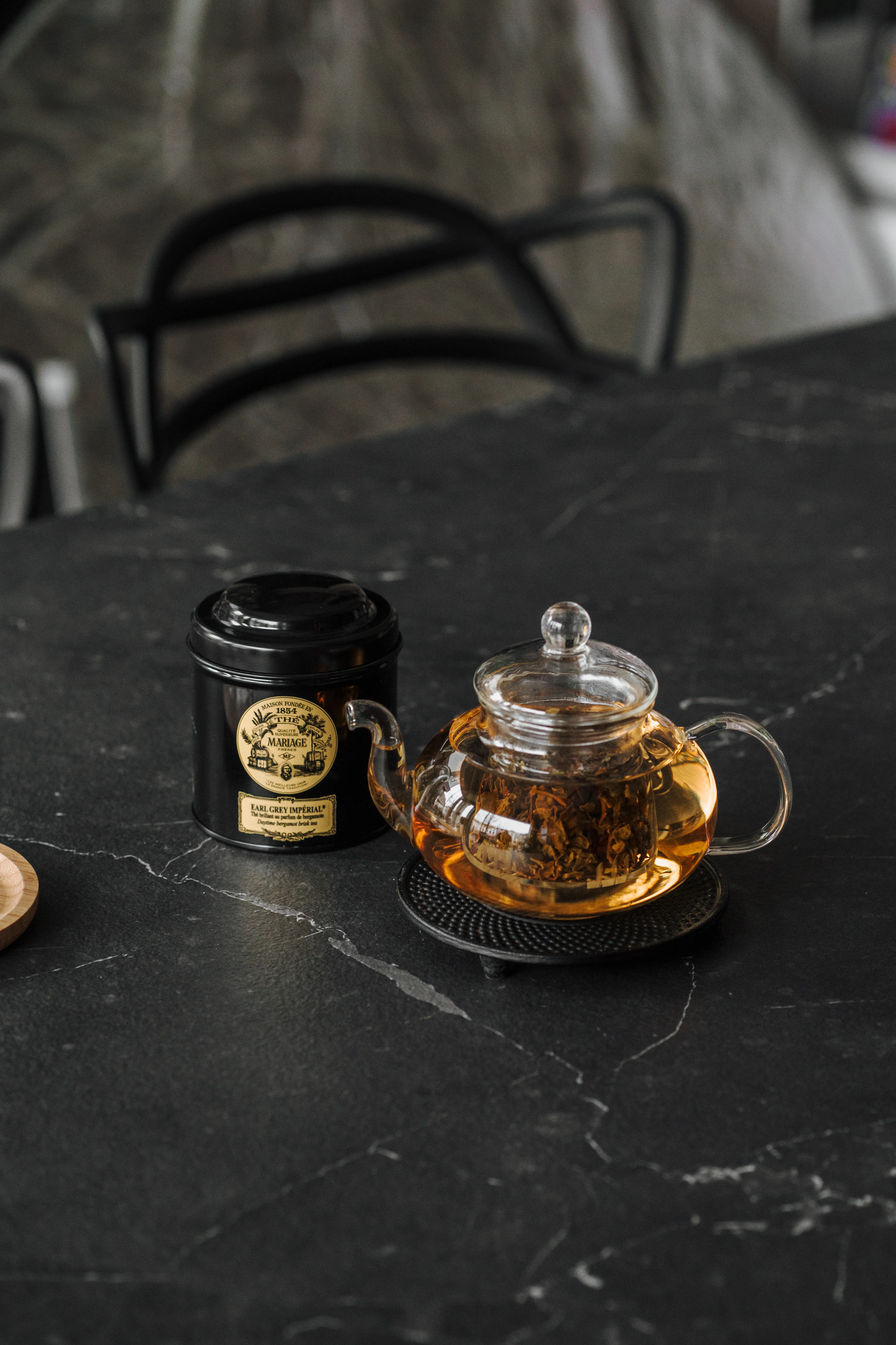 Je start met een glas frisse sparkling tea als feestelijke ontvangst. Daarna serveren wij één pot thee, zorgvuldig voor je geselecteerd uit ons assortiment van onder andere Mariage Frères of Le Parti du Thé. Uiteraard stemmen we de thee af op het moment en het seizoen.